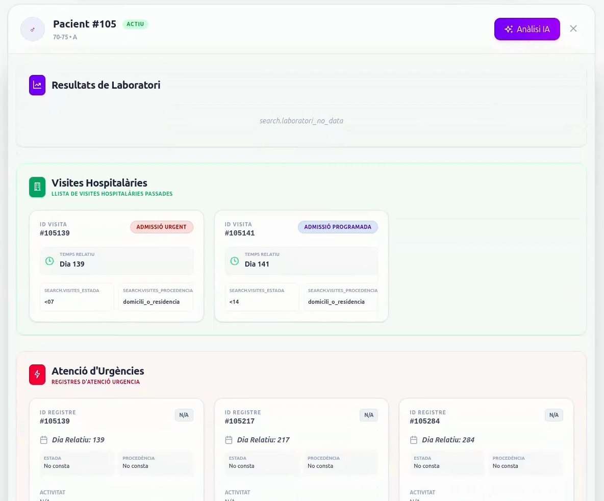 - Repte 2 (Predictor de Risc d’Urgències a 30 Dies): Avaluació de pacients complexos per predir una descompensació imminent, optimitzant la gestió de llits i recursos a curt termini.